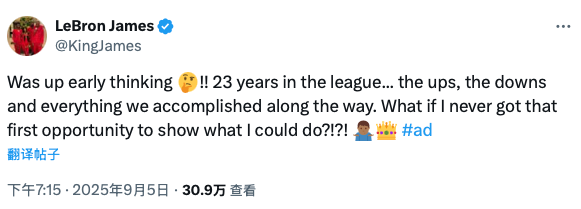 在参加活动间隙,詹姆斯突然更新了社交媒体,发文表示:“一觉醒来陷入了沉思,在联盟这23年里经历了跌宕起伏,一路取得了很多成就。如果当初我没有得到那个展示自己能力的机会,会发生什么呢?”